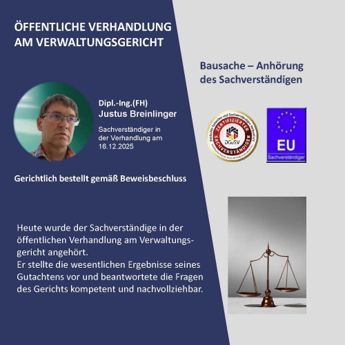 Öffentliche Anhörung vor dem Verwaltungsgericht - ein Einblick in unsere Sachverständigentätigkeit.Am 16.12.2025 wurde Dipl.-Ing. (FH) Justus Breinlinger als gerichtlich bestellter Sachverständiger vor dem Verwaltungsgericht angehört.